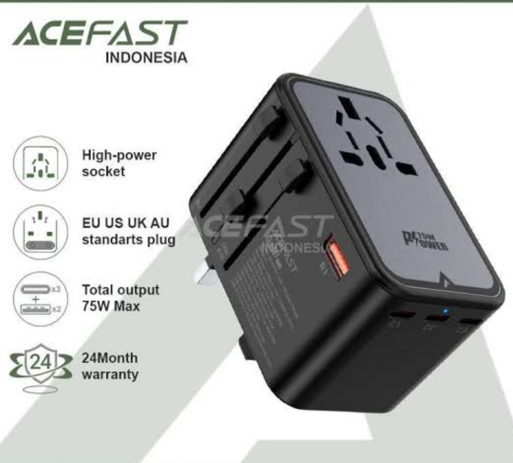 - Acefast Z1 GaN travel adapter / charger with power delivery up to 75W with Power Delivery standard, 3 USB-C ports and 2 USB-A ports