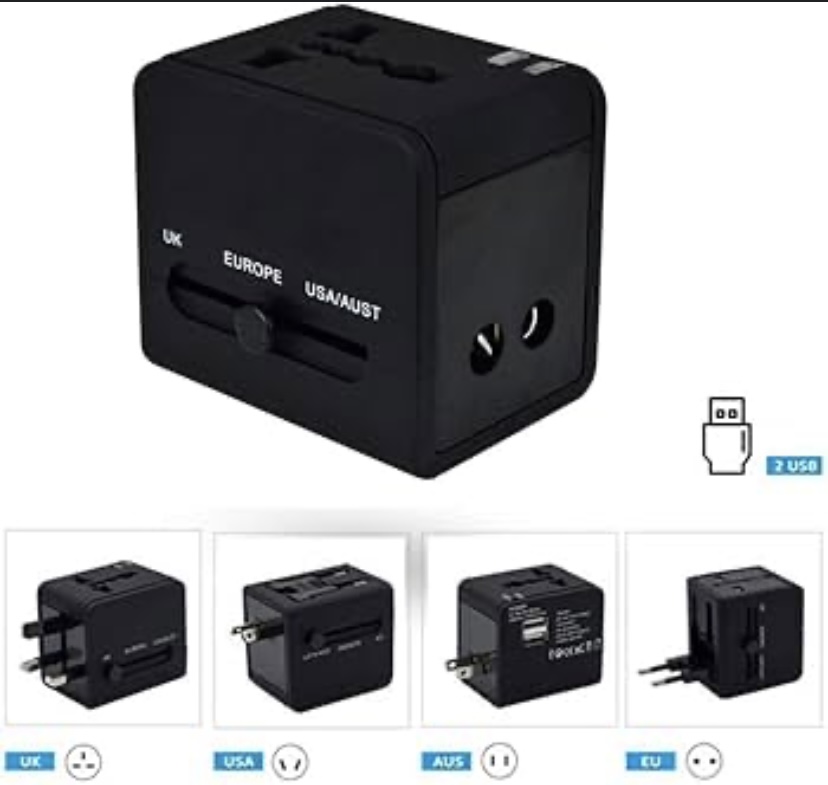- It supports multiple plug types (likely UK/US/EU/AU) for use in over 224 countries.