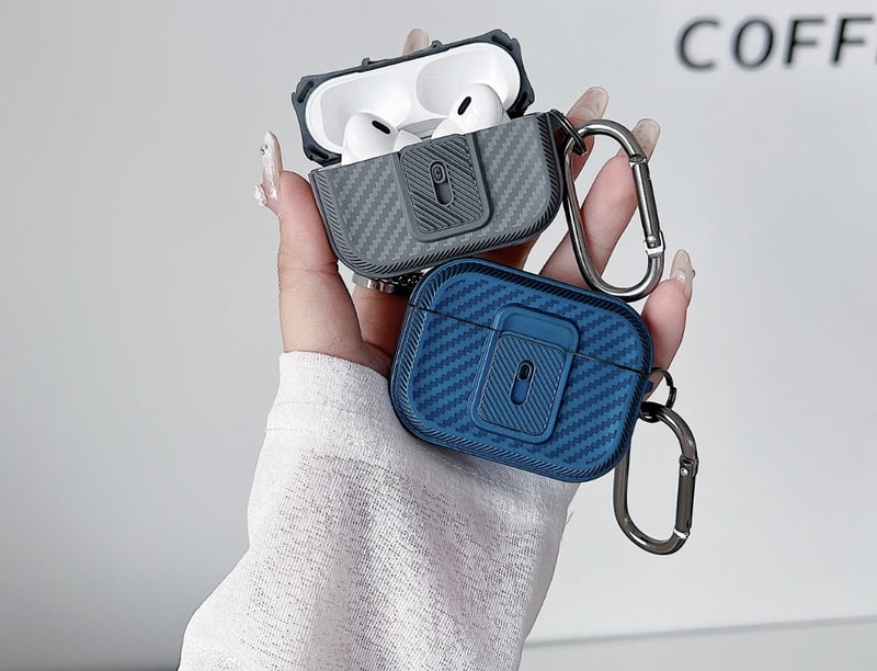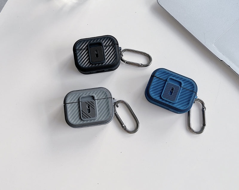 AirPods cases are made from various materials such as plastic, silicone, and leather. This particular case is made of TPU material and has a metal clip.