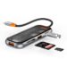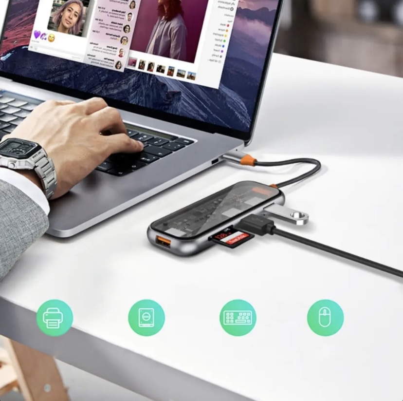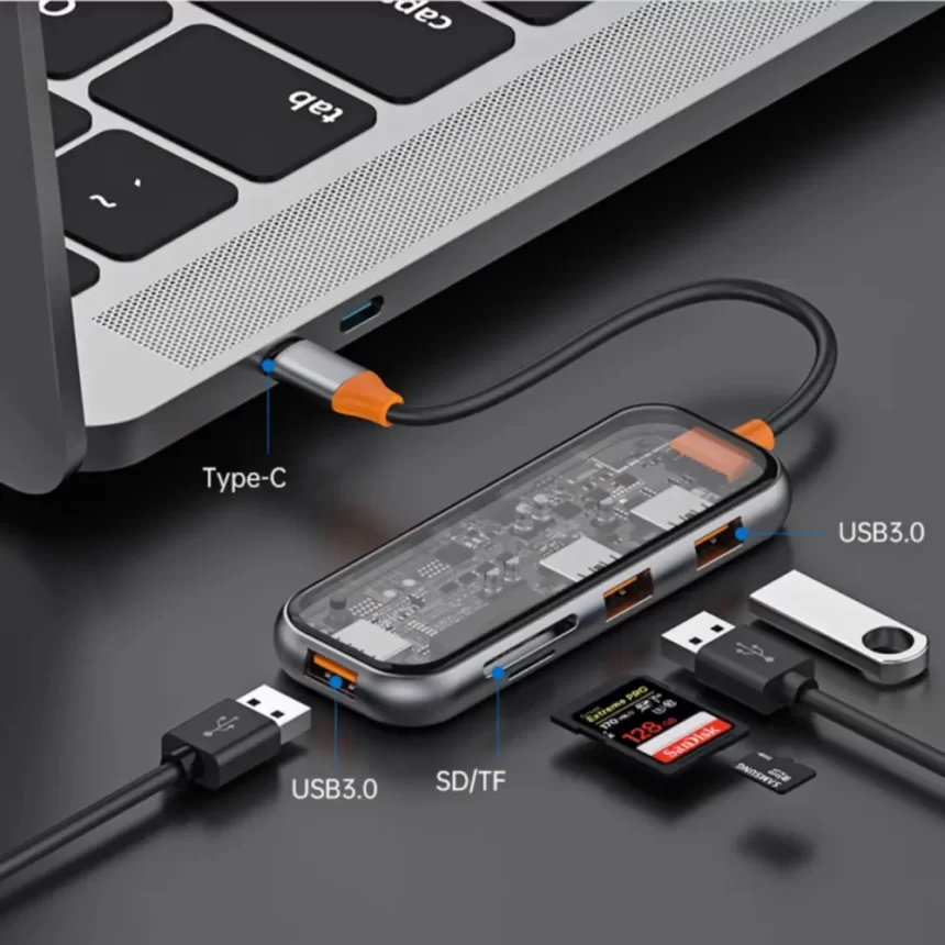 a multifunctional USB-C hub. It has multiple ports, including 3 USB 3.0 ports, 1 SD card slot, and 1 TF card slot. This hub allows for connecting external devices like mice, keyboards, hard drives, and more to devices with a USB-C port. It supports fast data transfer and can read SD and TF cards simultaneously. The hub is made of zinc alloy, is compact, portable, and offers fast heat dissipation.