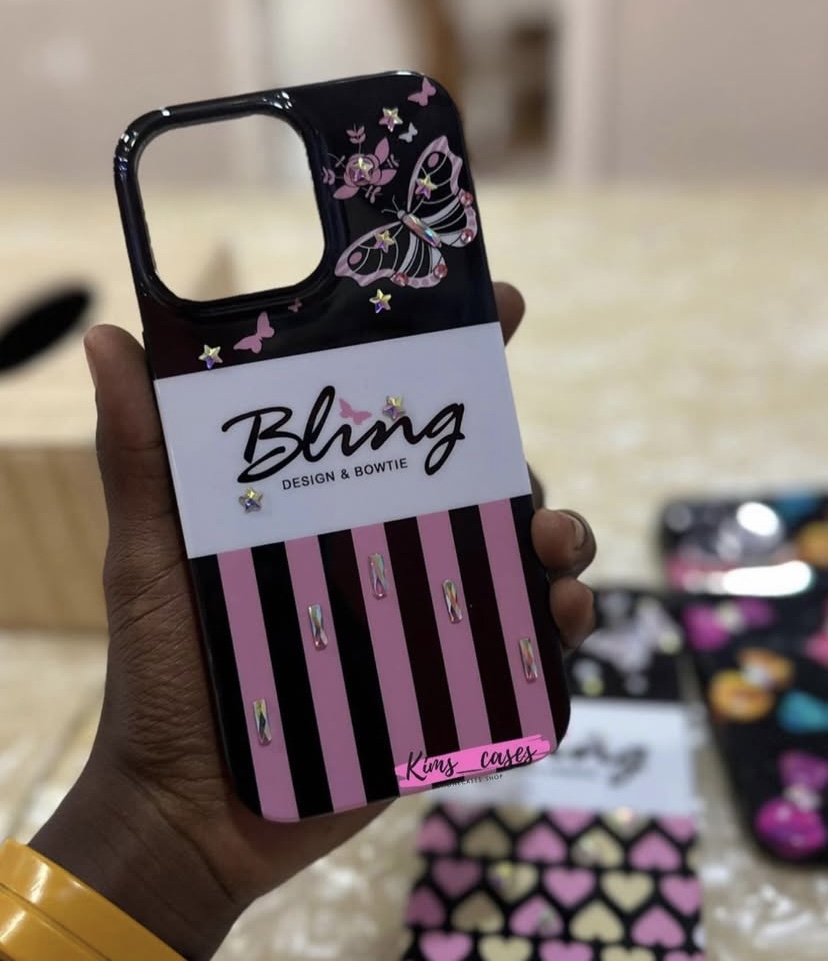 • It features a stylish design with butterflies and a striped pink and black pattern, enhanced with sparkle elements.