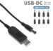 This cable is designed to charge devices using a USB connection. It has an input of 5.0V DC and can provide outputs of 9V and 12V DC, which are common for various electronic devices.