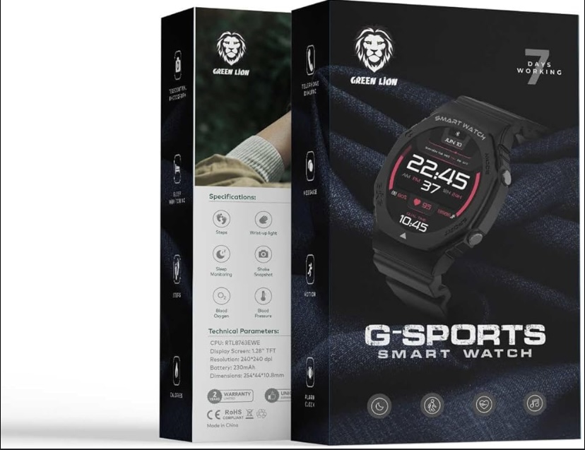 Green Lion G-Sport Smart Watch is an Android and IOS compatible watch which is equipped with a 1.28″ screen combined by resolution of 240*240 dpi. This combination ensures a clear and detailed visual experience with Thin-Film Transistor (TFT) technology and Wrist-up light, allowing users to view information, images, and text with sharpness and accuracy with vibrant colors and wide viewing angles of the TFT display. Despite the high resolution, the smartwatch manages to maintain a reasonable battery capacity (230 mAh) with satisfying life for up to 7 days, making it a brilliant choice for users to whom both functionality and visual quality matters.